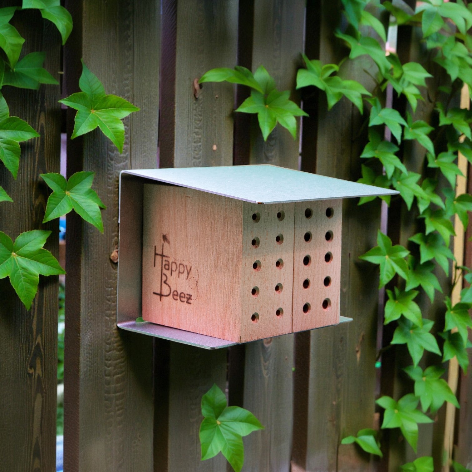 Hoogwaardig bijenhotel voor solitaire bijen, met verwisselbare cassettes. Gemaakt van duurzaam Douglas hout en beschermd met een RVS ombouw, geschikt voor tuin, balkon en educatieve omgevingen.